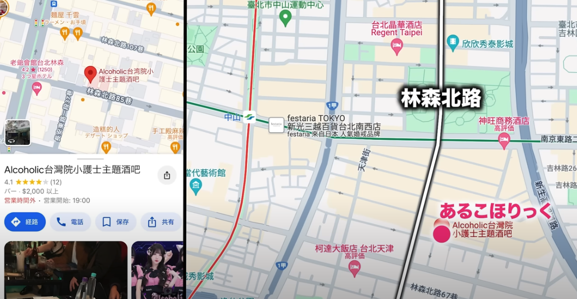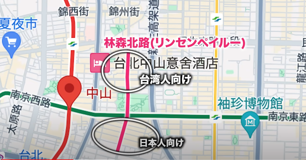 林森北路は公園を挟んで北側が台湾人向けの店、南側に日本人向けの店が集まっている。